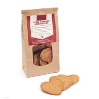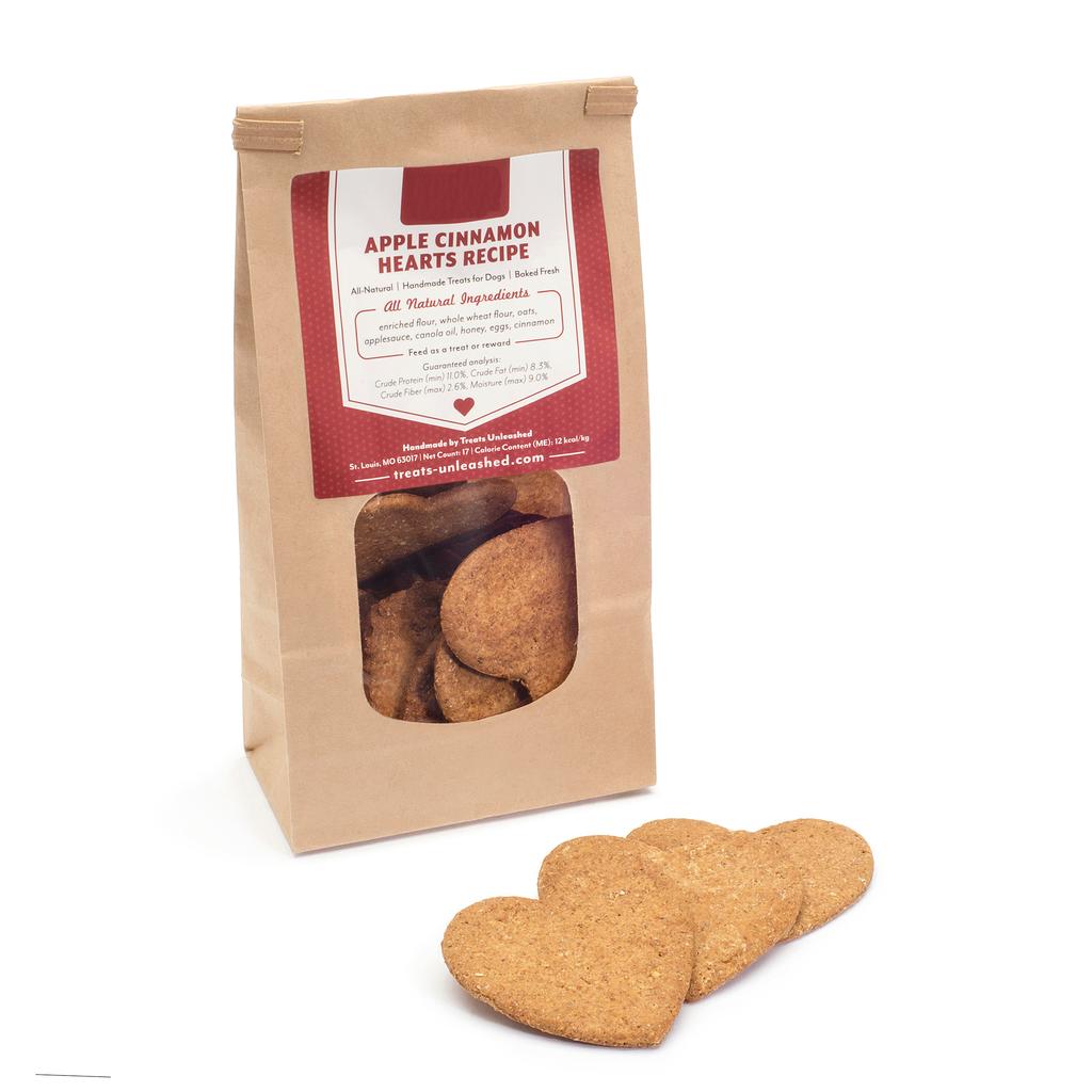 Like all of our fresh baked biscuits, our Apple Cinnamon Hearts are mixed from scratch, cut by hand and oven baked to provide you and your dog a healthy treat.