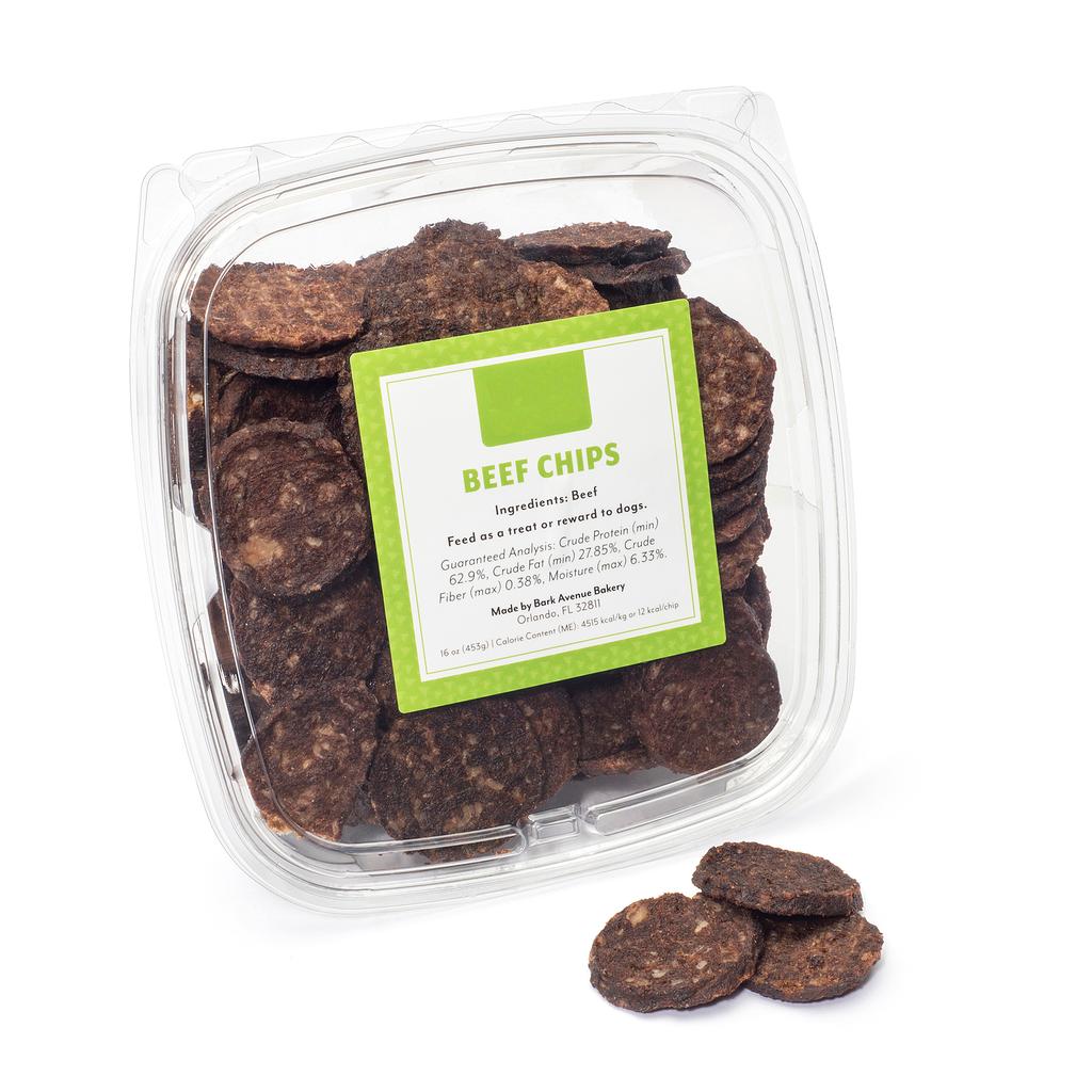 Only one ingredient: Beef. Dried beef chips are a great source of protein and dogs love them!