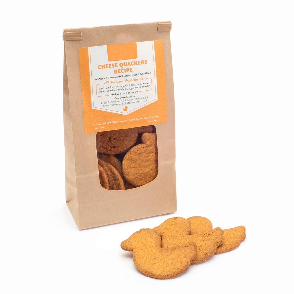 Like all of our fresh baked biscuits, our Cheese Quackers are mixed from scratch, cut by hand and oven baked to provide you and your dog a healthy treat.