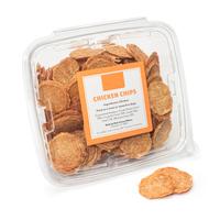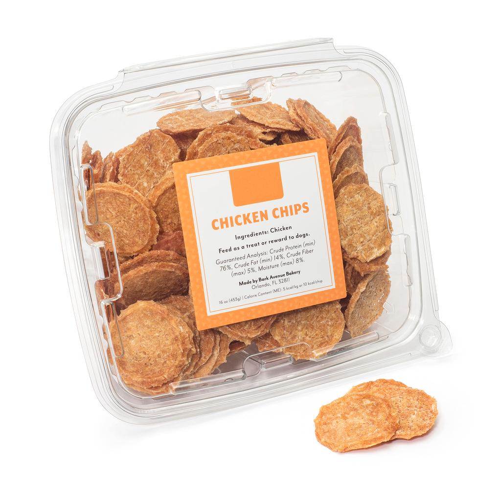 Only one ingredient: Chicken. Dried chicken chips are a great source of protein and dogs love them!