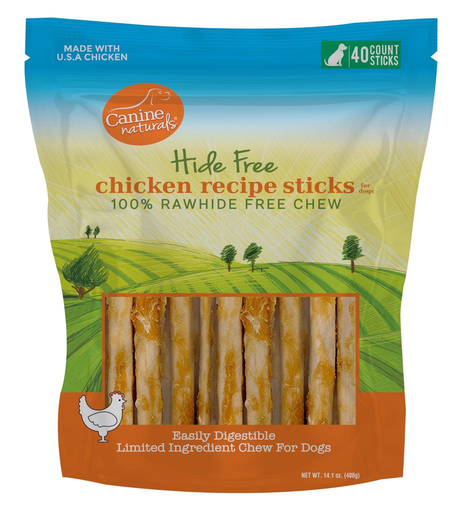 Hide Free Chicken Chews start with U.S.A. Sourced and Raised Chicken as the first ingredient and use ABSOLUTELY NO RAWHIDE OR COLLAGEN in production. Available in retriever rolls, knots, and sticks and in sizes from mini to extra-large we have the perfect sized chew for your dog.