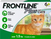 Help protect your kitty from pests with Frontline Plus Flea & Tick Treatment for Cats & Kittens. This flea and tick treatment is specially formulated to kill adult fleas, flea eggs, flea larvae, chewing lice and ticks, including ticks that may transmit Lyme disease. It’s made with two active ingredients—fipronil and (S)-methoprene—to help disrupt the flea life cycle and prevent future infestations. Each fast-acting topical application offers 30 days of waterproof protection. FRONTLINE Plus for Cats is purr-fect for cats and kittens eight weeks or older weighing over 1.5 pounds.