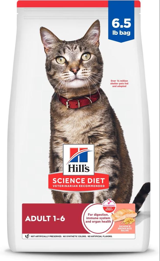 Salmon, Brown Rice, Corn Protein Meal, Chicken Fat, Wheat Gluten, Whole Grain Wheat, Chicken Meal, Pea Protein, Yellow Peas, Cracked Pearled Barley, Whole Grain Corn, Whole Grain Oats, Dried Beet Pulp, Chicken Liver Flavor, Lactic Acid, Soybean Oil, Calcium Sulfate, Potassium Chloride, Iodized Salt, Fish Oil, Choline Chloride, Fructooligosaccharides (FOS), vitamins (Vitamin E Supplement, L-Ascorbyl-2-Polyphosphate (source of Vitamin C), Thiamine Mononitrate, Niacin Supplement, Calcium Pantothenate, Vitamin A Supplement, Riboflavin Supplement, Pyridoxine Hydrochloride, Biotin, Vitamin B12 Supplement, Folic Acid, Vitamin D3 Supplement), Taurine, minerals (Ferrous Sulfate, Zinc Oxide, Copper Sulfate, Manganous Oxide, Calcium Iodate, Sodium Selenite), Mixed Tocopherols for freshness, Natural Flavors, Beta-Carotene.