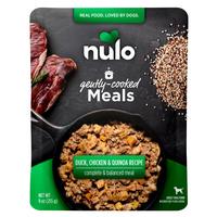 Duck, Chicken, Brown Rice, Duck Broth, Chicken Broth, Chicken Hearts, Sweet Potato, Quinoa, Carrots, Green Beans, Apples, Sunflower Oil, Dried Egg, Tomato Paste, Flaxseed, Pea Fiber, Cranberries, Tricalcium Phosphate, Salmon Oil, Guar Gum, Potassium Chloride, Apple Cider Vinegar, Choline Chloride, Salt, Magnesium Sulfate, Thyme, Parsley, Iron Amino Acid Chelate, Zinc Amino Acid Chelate, Vitamin E Supplement, Vitamin B1 (Thiamine Mononitrate), Vitamin A Supplement, Turmeric, Vitamin B3 (Niacin), Manganese Amino Acid Chelate, Copper Amino Acid Chelate, Calcium Iodate, Vitamin B5 (Calcium Pantothenate), Vitamin B2 (Riboflavin), Vitamin B12 Supplement, Vitamin B6 (Pyridoxine Hydrochloride), Vitamin D3 (Cholecalciferol), Vitamin B9 (Folic Acid), Vitamin B7 (Biotin).