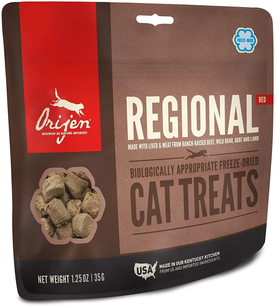 ORIJEN Freeze-Dried Treats are crafted with the same quality ingredients that make up our trusted foods. Crafted with your cat’s nutritional needs in mind, Regional Red Treats are made from 100% raw ranch-raised beef, grass-fed lamb, wild boar, and Boer goat ingredients, gently freeze-dried to lock in the natural, nourishing nutrients and rich protein for a treat that is as healthy as it is delicious.