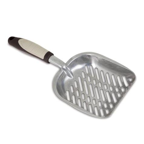If you're having a hard time handling large amounts of litter clumps with your current litter scoop, the Petmate® Metal Litter Scoop is just the scoop you need. It's slotted scoop bowl is made from heavy-duty aluminum built to withstand years of scoopings (we know, not fun). Featuring a large bowl and sharp edges to scrap off tough-to-remove waste, the Petmate Metal Litter Scoop makes cleaning the litter box faster and easier. The two-toned, TPR handle is pliable and has an ergonomic comfortable grip for mess-free ease of use. To clean the Metal Litter Scoop, simply rinse it off with water. For easy storage, this scoop has a hanging hole.