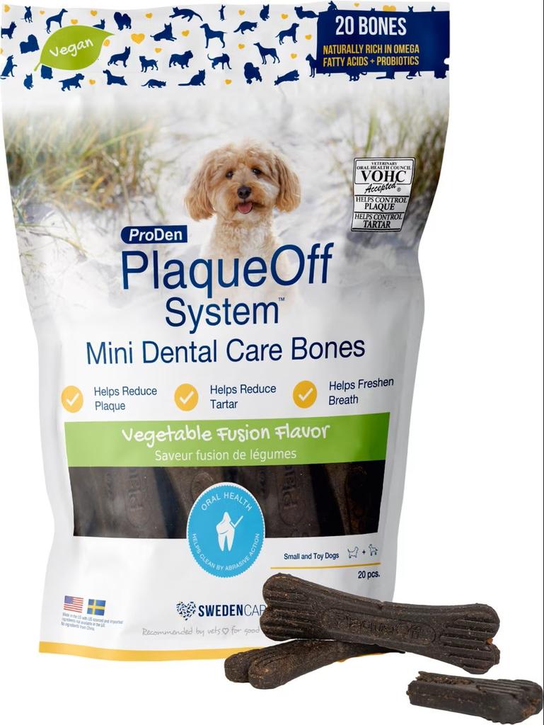 Turn treat time into teeth-cleaning time with the ProDen PlaqueOff System Dog Dental Care Bones Vegetable Fusion Flavor. These gnaw-tastic dental care chews are made with natural sea kelp and algae to help clean teeth, reduce tartar, and freshen breath. It’s the 100% natural complement to your pal’s dental hygiene that he’ll love as an anytime reward. They’re also a great source of omega-3 and 6 fatty acids from flaxseeds for overall wellness and healthy inflammation. Made with wholesome ingredients like sweet potatoes, carrots, pumpkin, kelp, alfalfa, and vegan probiotics, you can feel good about giving them to your pup. Plus, they contain no grain, wheat, gluten, soy, corn, artificial flavors, colors, or preservatives.