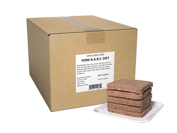 Pork, pork heart, pork liver, pork bone, carrots, broccoli, kale, goat’s milk, chia seeds, flaxseed, kelp, salmon oil, taurine, green mussel, inulin, coconut oil, sesame seeds, ground eggshell