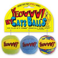 Yes, you read it correctly. Three Yeowww! organic catnip filled balls on one header card are sure to be a hit. My Cats Balls will send kitty to new heights of pleasure the minute they start to fondle them. Each ball is 2” in diameter and full of nip.